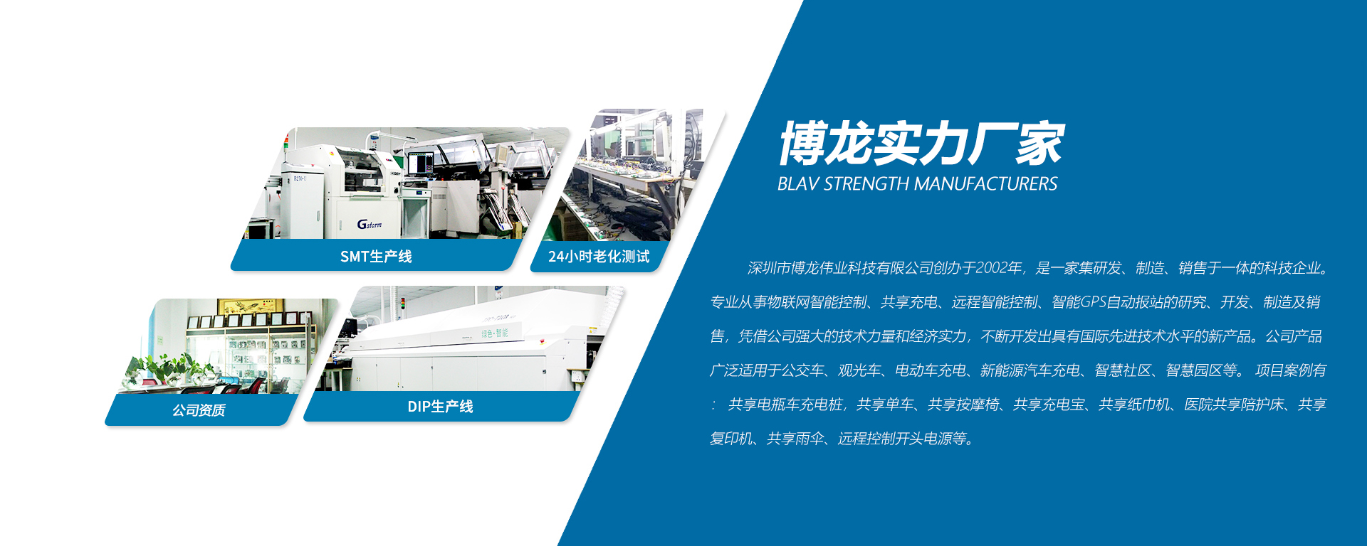 深圳市博龍偉業(yè)科技有限公司創(chuàng)辦于2002年,是一家集研發(fā)、制造、銷售于一體的科技企業(yè)。專業(yè)從事物聯(lián)網(wǎng)智能控制、共享充電、遠(yuǎn)程智能控制、智能GPS自動報(bào)站的研究、開發(fā)、制造及銷售,憑借公司強(qiáng)大的技術(shù)力量和經(jīng)濟(jì)實(shí)力,不斷開發(fā)出具有國際先進(jìn)技術(shù)水平的新產(chǎn)品。公司產(chǎn)品廣泛適用于公交車、觀光車、電動車充電、新能源汽車充電、智慧社區(qū)、智慧園區(qū)等。 項(xiàng)目案例有: 共享電瓶車充電樁,共享單車、共享按摩椅、共享充電寶、共享紙巾機(jī)、醫(yī)院共享陪護(hù)床、共享復(fù)印 機(jī)、共享雨傘、遠(yuǎn)程控制開頭電源等。
